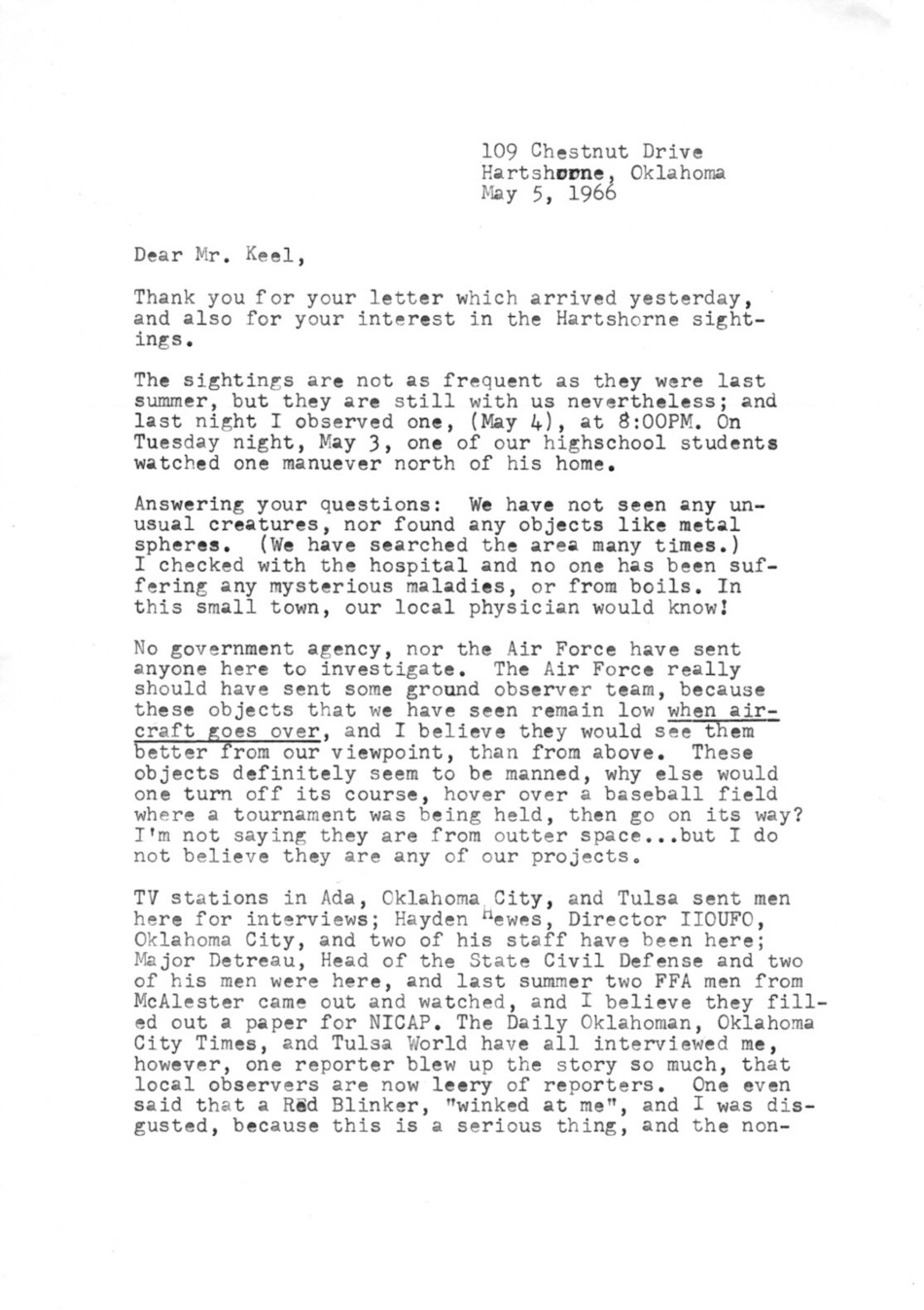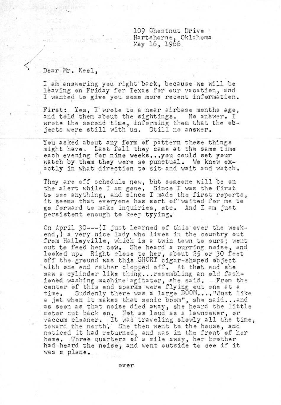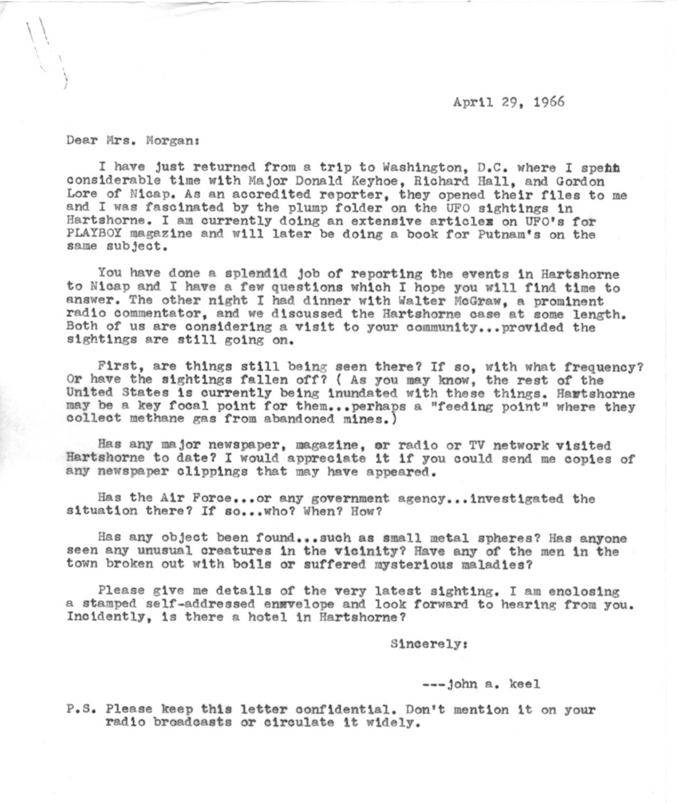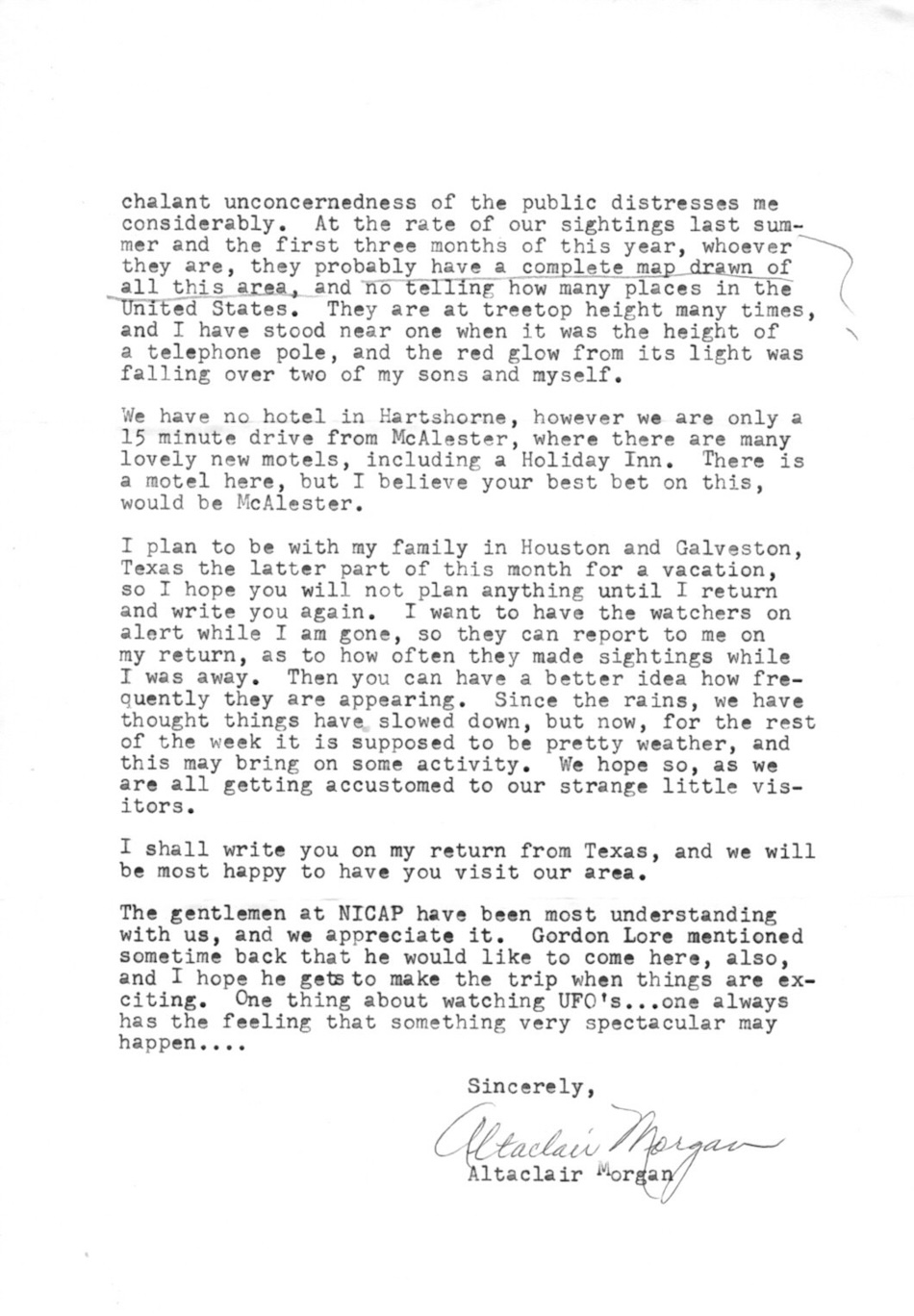 obligatorily Altaclair Morgan responds to John’s letter (see last post). She reports recent sightings with, as he’d requested, details about their pattern of appearances. Oddly (to me), she writes that they showed up at the same time very evening for weeks, but doesn’t give the time. Nor does she give any details about the “GLOB” she saw fall from one of the objects; it’s not mentioned in Gordon Lore’s NICAP report.
